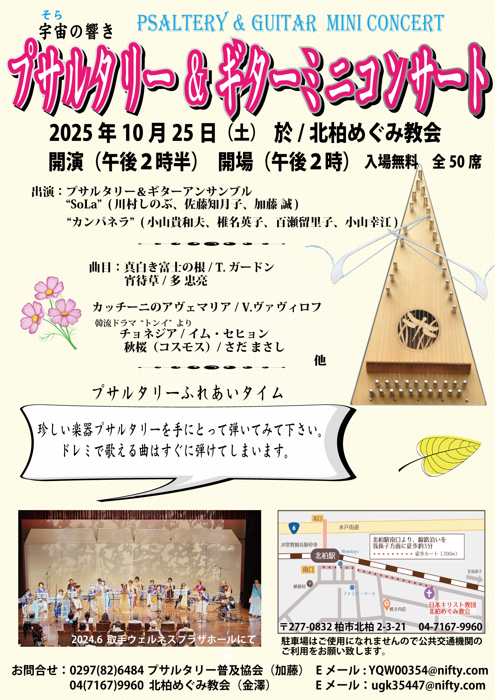 | ★2025年10月25日(日) | プサルタリー&ギターミニコンサート(北柏めぐみ教会)入場無料 | 0297(82)6484 |